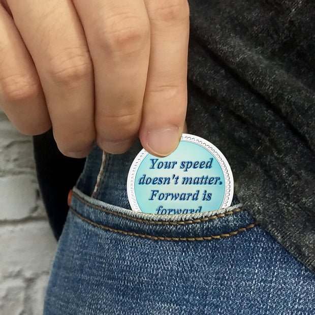 - "ONE DAY AT A TIME" – Daily Inspiration: Engraved with the powerful mantra "ONE DAY AT A TIME," this sober coin is a daily reminder to focus on today’s progress. Sobriety isn't rushed—it’s lived in the present. Keep this AA token close as a symbol of your strength. Ideal as an AA medallion, sobriety gift for women, or recovery token for loved ones. One day at a time, forward is always forward Calm Strength in Every Step: The reverse side features a serene blue background with the affirmation: “Your speed doesn’t matter. Forward is forward.” Designed to instill inner peace, this AA chip emphasizes self-compassion and steady growth. A meaningful sober medallion and recovery chip for those embracing progress over perfection in their sobriety journey