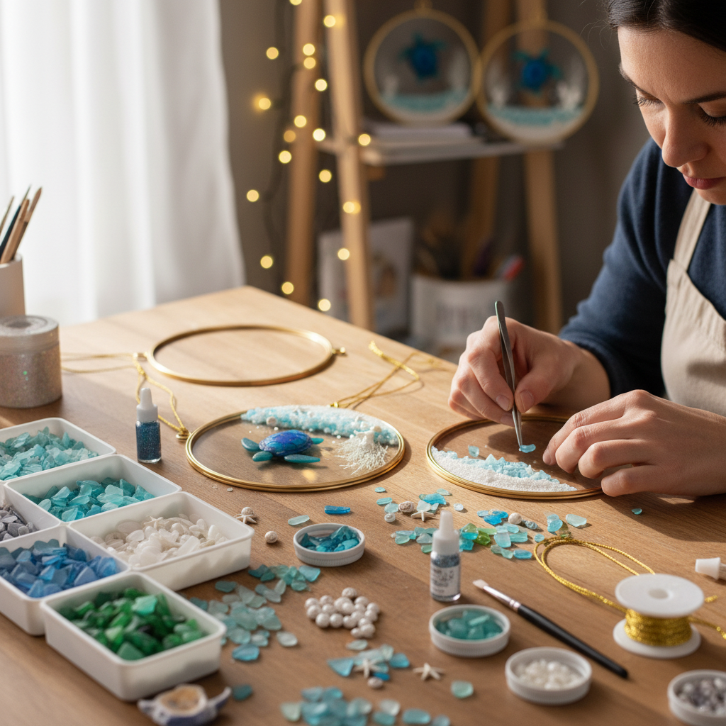 Artisan Details: Enhanced with miniature pearls, corals, seashells, and sand, all set within a golden frame for a refined coastal look.